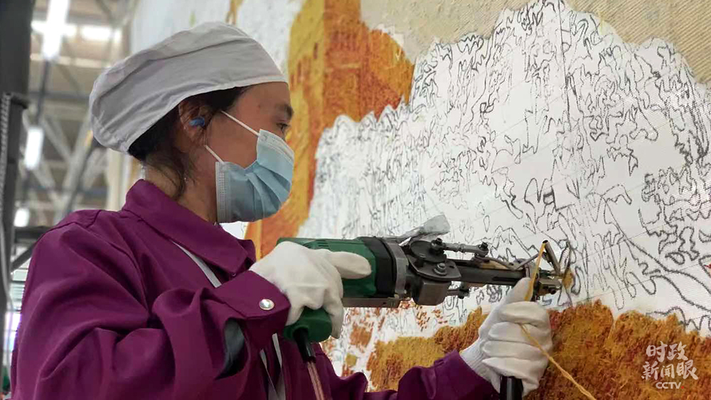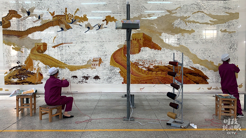 △這幅手工槍刺藏毯以長(zhǎng)城為原型,面積接近14平方米。兩人同時(shí)操作需兩個(gè)月時(shí)間完成。(總臺(tái)央視記者王鵬飛、楊松濤拍攝)