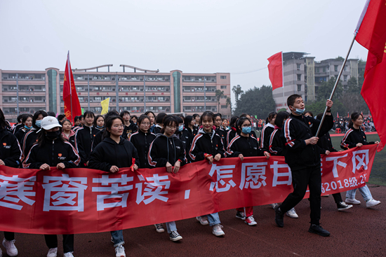 3月9日,高考誓師大會(huì)現(xiàn)場(chǎng),我們班的學(xué)生舉著橫幅和班旗,列隊(duì)準(zhǔn)備走過(guò)主席臺(tái)。橫幅上寫(xiě)著“同是寒窗苦讀,怎愿甘拜下風(fēng)”。