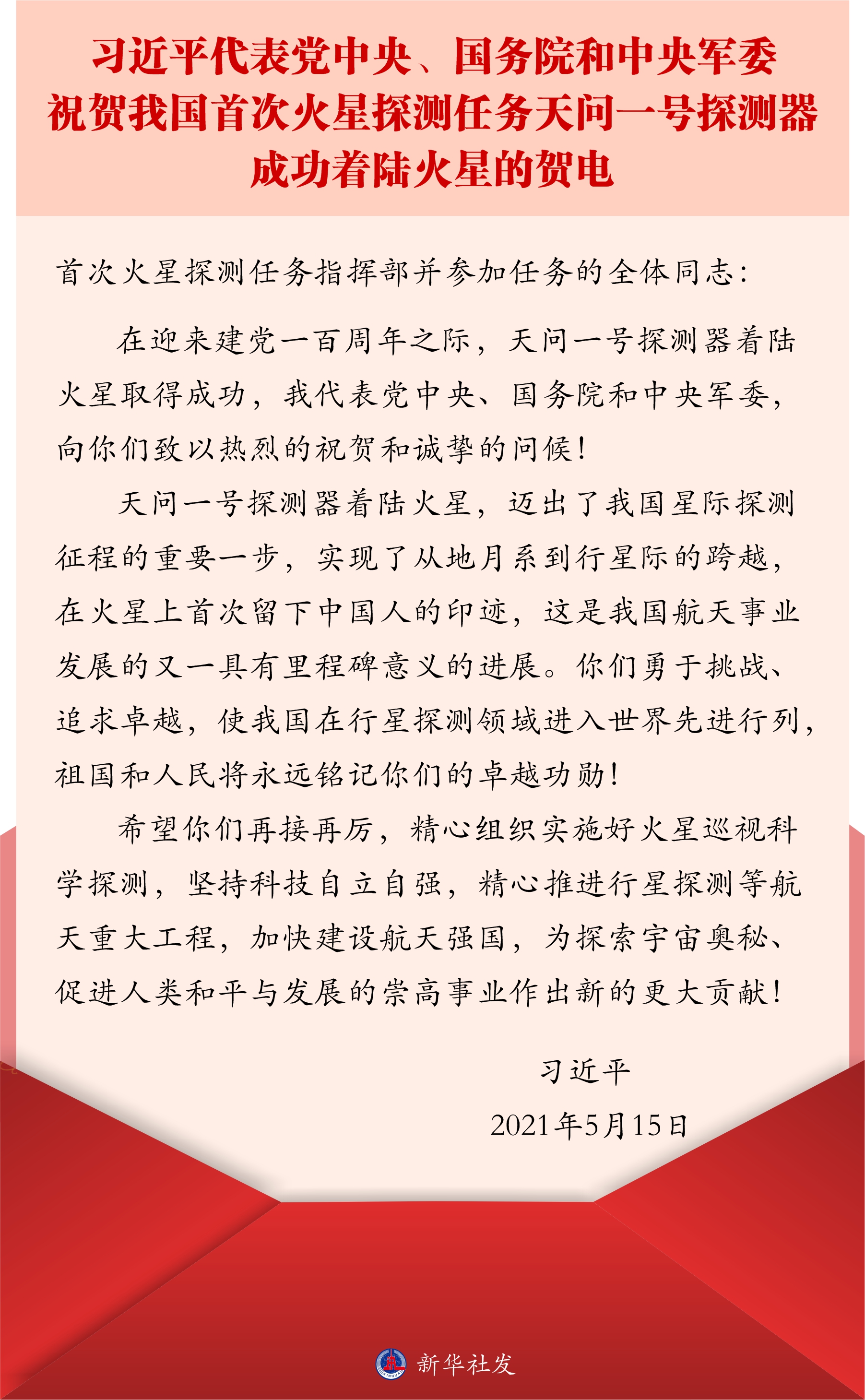 ↑2021年5月15日,習(xí)近平代表黨中央、國務(wù)院和中央軍委致電祝賀我國首次火星探測任務(wù)天問一號(hào)探測器成功著陸火星。