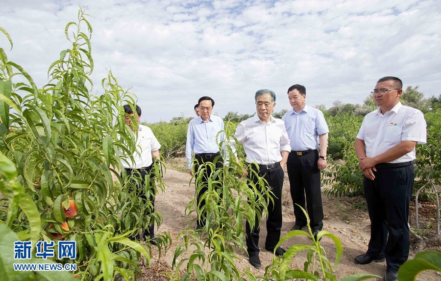 7月21日至24日,中共中央政治局常委、全國政協(xié)主席汪洋在新疆調(diào)研兵團(tuán)工作。這是23日,汪洋在兵團(tuán)十師北屯市千畝桃園了解果樹長勢。新華社記者 李濤 攝