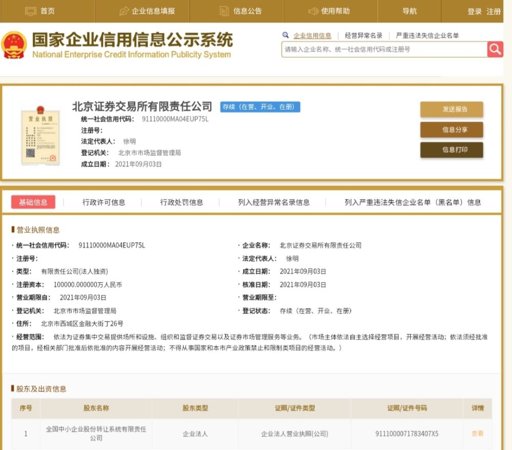 北京證券交易所有限責任公司注冊成立,將讓越來越多“專精特新”企業(yè)得到資本市場助力。圖片來源:國家企業(yè)信用信息公示系統(tǒng)官網(wǎng)