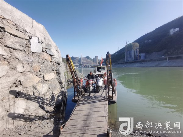 大橋通車前坐渡船過江的居民和遠(yuǎn)處的大橋