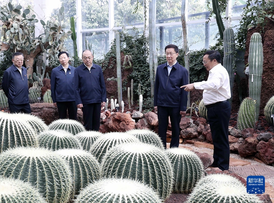 10月11日至12日,中共中央政治局常委、國務(wù)院副總理韓正在云南調(diào)研。這是10月12日,韓正在中國科學(xué)院昆明植物研究所大溫室聽取生物多樣性研究與保護(hù)等工作情況匯報。新華社記者 劉衛(wèi)兵 攝