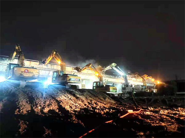 在施工現(xiàn)場,隨著指揮員的一聲令下,50多臺設(shè)備齊裝上陣,轟隆作業(yè)。由于該兩座橋同時上跨京滬高速公路,現(xiàn)場作業(yè)空間有限。為確保此次拆橋任務(wù)安全順利進(jìn)行,同時降低施工影響,京滬高速公路HA4標(biāo)項目部對施工現(xiàn)場進(jìn)行詳細(xì)調(diào)查,多次組織召開專家施工方案評審會,反復(fù)論證,細(xì)化橋梁拆除方案,精準(zhǔn)把控施工計劃;項目部領(lǐng)導(dǎo)班子和管理人員,全稱盯控,確保拆除工作萬無一失。