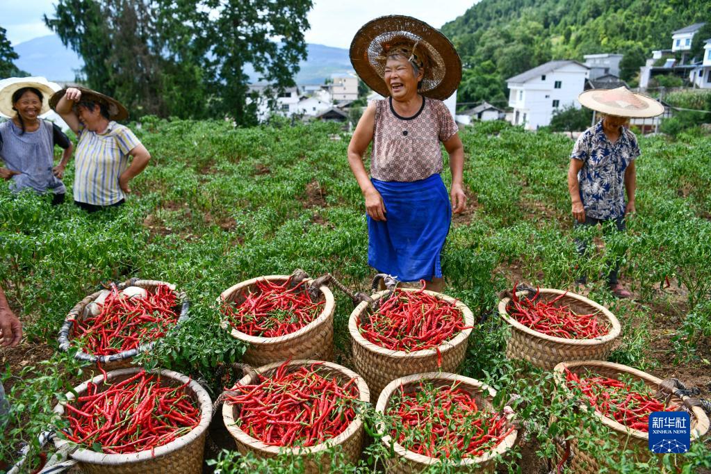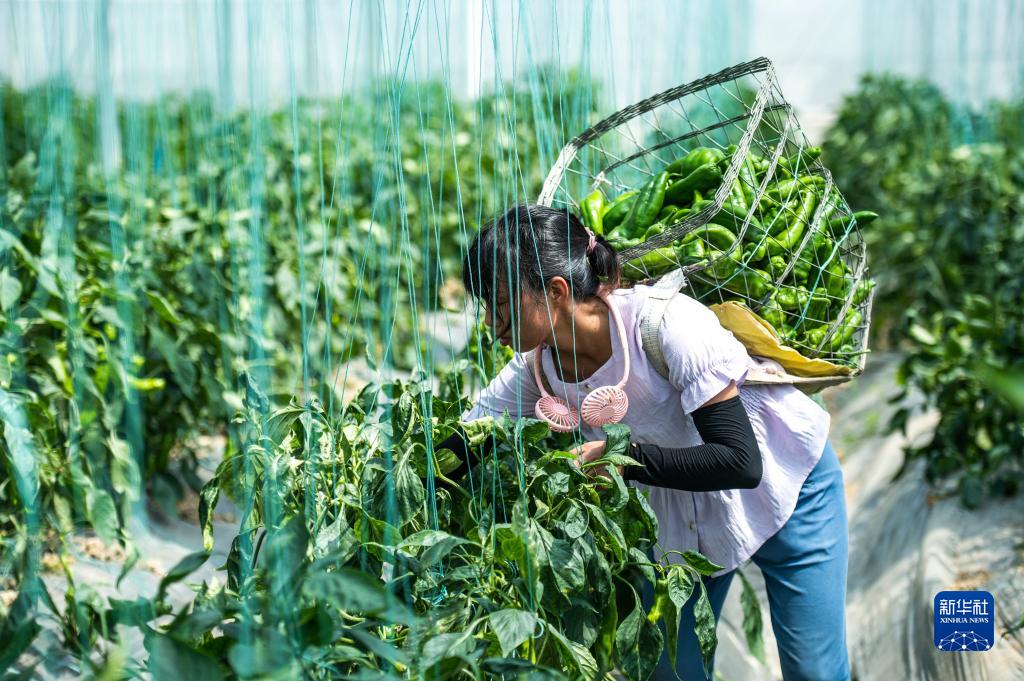 村民在貴陽農(nóng)投集團(tuán)奇申蔬菜基地采收牛角椒(7月29日攝)。新華社記者 陶亮 攝