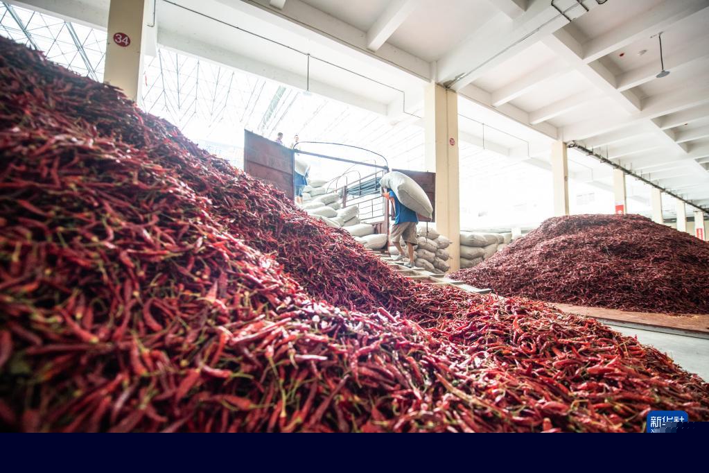 工人在遵義市新蒲新區(qū)中國辣椒城搬運辣椒進(jìn)行裝車(2020年8月13日攝)。新華社記者 陶亮 攝