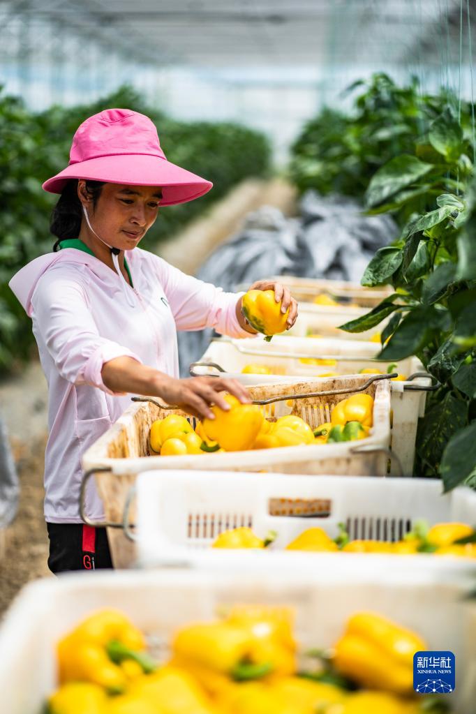 當(dāng)?shù)卮迕裨谫F陽農(nóng)投集團(tuán)花溪蔬菜基地采收的柿子椒(7月30日攝)。新華社記者 陶亮 攝