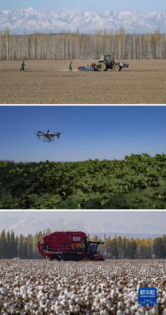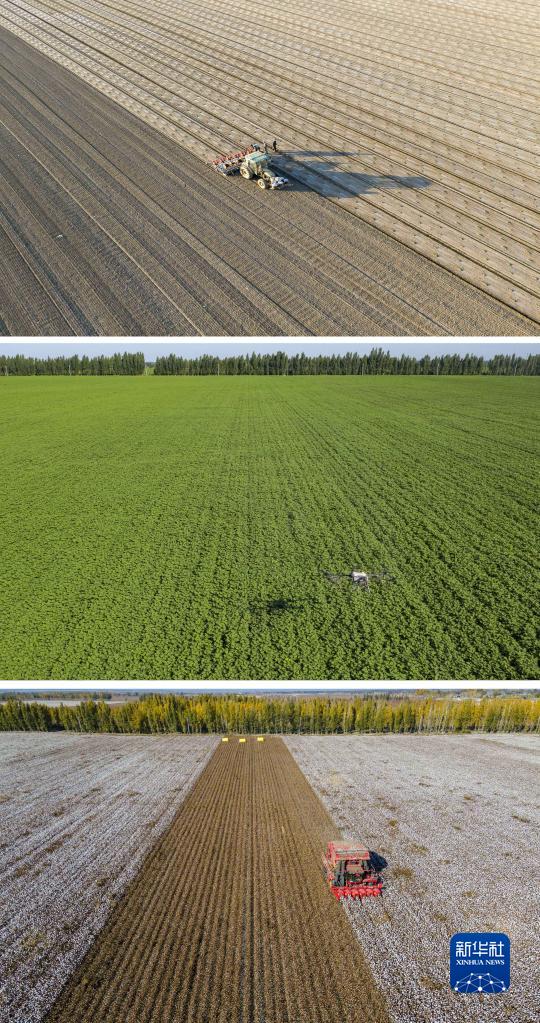 拼版照片:上圖為春播時節(jié),陸高林父子和雇來的工人一起操作機械在棉田里播種(4月15日攝);中圖為夏季田間管理時,農業(yè)植保無人機在陸高林家的棉田里打藥(7月15日攝);下圖為秋收時節(jié),陸高林雇來的采棉機在棉田里采收棉花(10月24日攝)。新華社記者 胡虎虎 攝