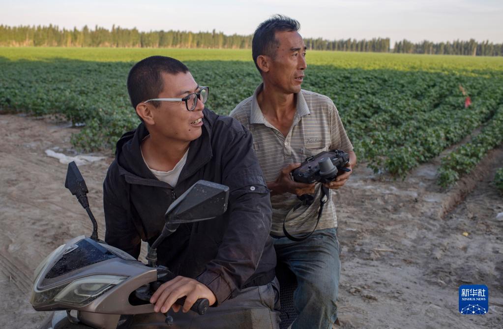 盛夏田間管理期間,陸高林的兒子陸德文(左)騎摩托車帶著農業(yè)植保無人機操作手圍著棉地規(guī)劃飛防作業(yè)路線(7月15日攝)。新華社記者 胡虎虎 攝