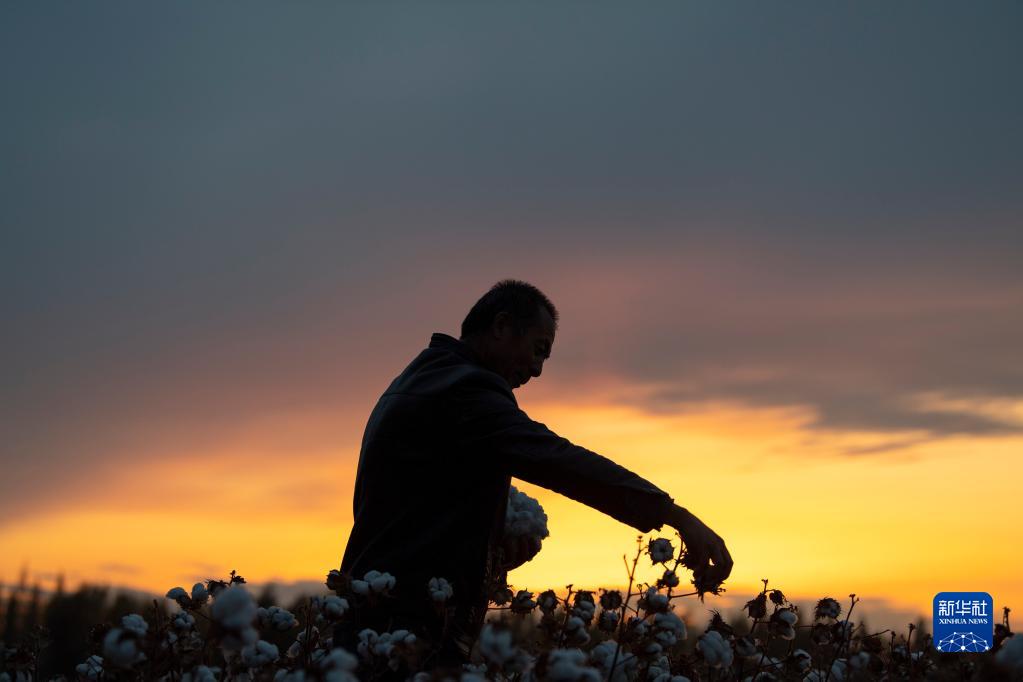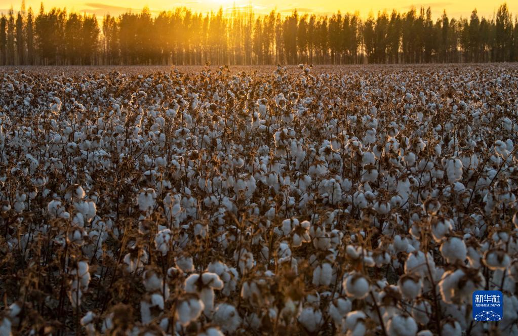 秋收時節(jié),雨過天晴,落日余暉灑落在陸高林家待采收的棉田里(10月23日攝)。新華社記者 胡虎虎 攝