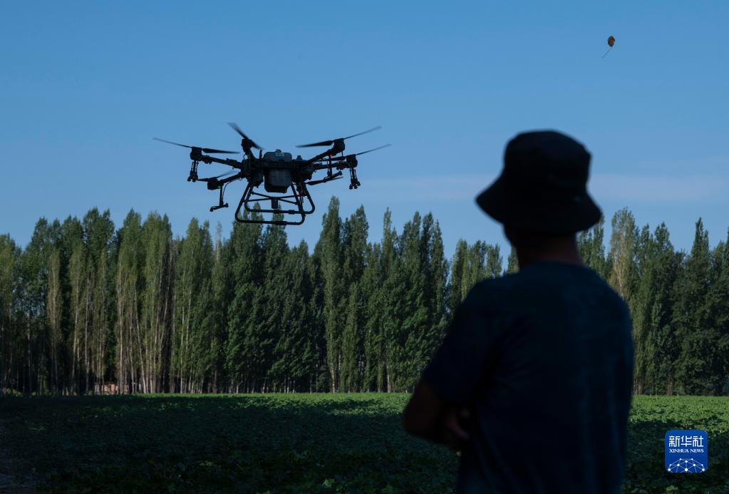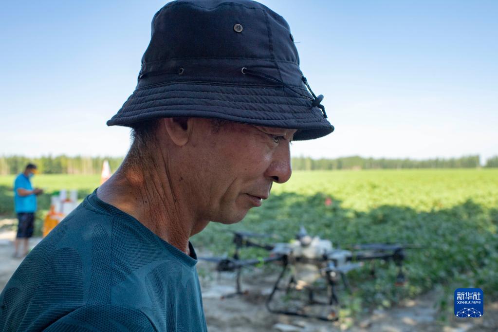 盛夏田間管理期間,雇人使用植保無人機后,陸高林不用再像往常一樣駕駛拖拉機進棉田打藥,農活變得更為輕松高效(7月15日攝)。新華社記者 胡虎虎 攝