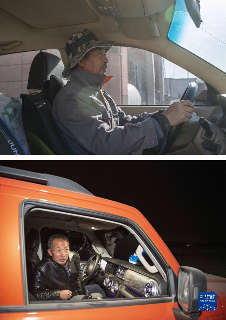 拼版照片:上圖為春播時節(jié),陸高林開車載著農資去棉田干活(4月15日攝);下圖為秋收時節(jié),陸高林在新換的越野車內等候采棉機轉場(10月22日攝)。新華社記者 胡虎虎 攝