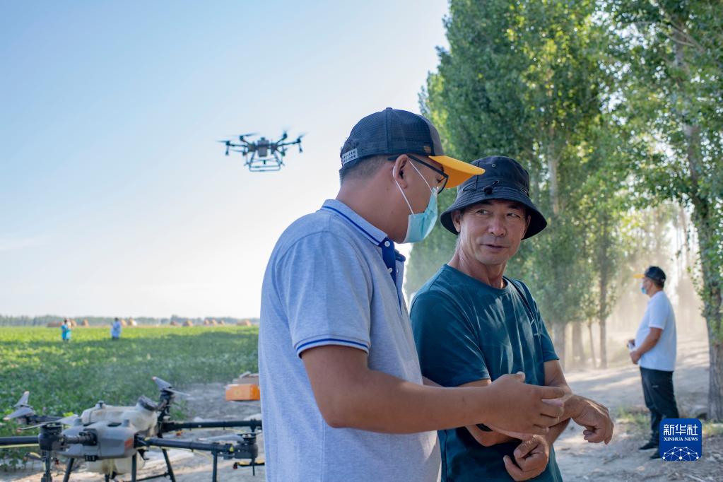 盛夏田間管理期間,陸高林(右)和沙灣市一家農業(yè)服務團隊負責人王福珖在棉田里談論農業(yè)植保無人機作業(yè)特點(7月15日攝)。新華社記者 胡虎虎 攝