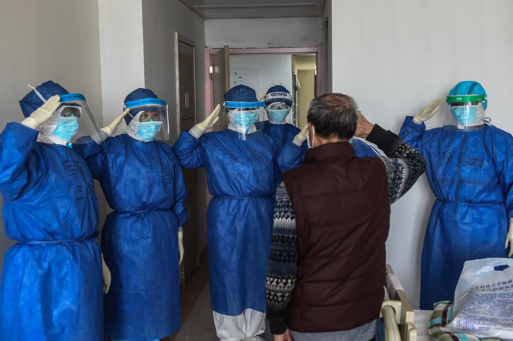 在中國湖北省婦幼保健院光谷院區(qū),一名即將出院的老年患者向醫(yī)護人員致敬(2020年3月14日攝)。新華社發(fā)(趙佳慶攝)
