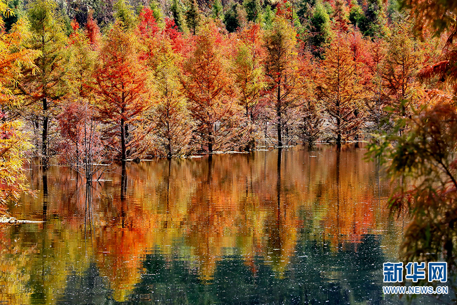 清澈的水面上倒映著一排排整齊的水杉樹(11月26日攝)。新華網(wǎng)發(fā)(盤龍區(qū)融媒體中心 供圖)