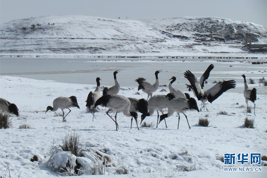 黑頸鶴在白雪中翩翩起舞(11月25日攝)。新華網(wǎng)發(fā)(鄭遠見 攝)
