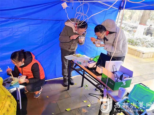 正當(dāng)隊(duì)員們準(zhǔn)備修整一天時(shí),新的命令到了,要求醫(yī)療隊(duì)安排300名隊(duì)員支援雁塔區(qū)核酸采集工作,大家毫無(wú)怨言,坐上了趕赴雁塔區(qū)的大巴。這是最不尋常的一天,醫(yī)療隊(duì)承擔(dān)了雁塔區(qū)近10個(gè)居民區(qū)的核酸采樣任務(wù),且大部分都屬于封控區(qū)。核算采樣需上門采集,風(fēng)險(xiǎn)大、難度高,因?yàn)樾畔⒉杉O(shè)備無(wú)法上樓,只能依靠人工信息錄入,隊(duì)員們身穿防護(hù)服,在操作極其困難的情況下做到了不漏一戶,不落一人。采集結(jié)束已是25日凌晨1點(diǎn),來(lái)自漢臺(tái)區(qū)的余晗和趙凌最后的采集任務(wù)已是凌晨2點(diǎn),此時(shí)的千年古都正飄落著冬日的雪花。這次入戶采集共完成49081人次