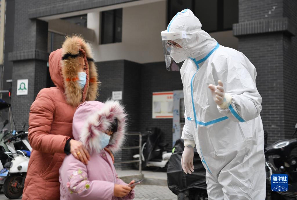 12月27日,在西安市雁塔區(qū)孟村小區(qū),盧晨陽(yáng)(右)向居民介紹核酸檢測(cè)注意事項(xiàng)。新華社記者 張博文 攝