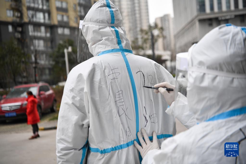 12月27日,在西安市雁塔區(qū)孟村小區(qū),社區(qū)工作人員在盧晨陽(yáng)的防護(hù)服寫(xiě)加油標(biāo)語(yǔ)。新華社記者 張博文 攝