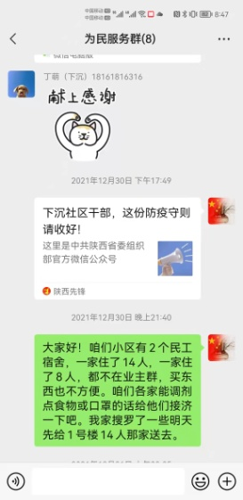 看著手里拎的幾顆白菜、蘿卜、西紅柿,我感到慚愧難當(dāng),作為一名黨員、一名下沉干部,實(shí)在是失職,沒(méi)有履行好“民之所憂,我必念之;民之所盼,我必行之”的使命擔(dān)當(dāng)。投送完愛(ài)心菜到家后,我立即在群里倡議小區(qū)下沉干部對(duì)1-3-2302的務(wù)工人員開(kāi)展愛(ài)心救助活動(dòng),并從自家的抗疫儲(chǔ)備物資里勻出了2袋子蔬菜、豆腐乳、魚(yú)醬罐頭、口罩、水果等物資,并附上了溫馨小紙條,寫(xiě)上我的聯(lián)系電話,鼓勵(lì)他們堅(jiān)定克服困難的信心和決心。第二天,社區(qū)領(lǐng)導(dǎo)、小區(qū)鄰居們得知情況后,紛紛伸出援助之手,不到半小時(shí),鍋灶有了、菜刀案板有了、糧食蔬菜也都有了…,社區(qū)的慰問(wèn)品也送來(lái)了。大伙不僅給他們送去了物資,更送去了關(guān)心和安慰,他們的生活起居也迅速融入了小區(qū)大家庭,業(yè)主群里每天都有人對(duì)他們噓寒問(wèn)暖,他們也經(jīng)常在業(yè)主群曬他們做的川味美食。他們私下跟我說(shuō),這幾年,他們?cè)诤?、新疆等地都遇到過(guò)疫情,但最讓他們感動(dòng)的還是西安,黨和政府的細(xì)致安排、西安人民的熱情相助,讓他們?cè)谒l(xiāng)異地孤立無(wú)援時(shí),第一次感到不慌了。