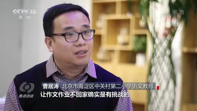 北京市海淀區(qū)中關(guān)村第二小學(xué)語(yǔ)文教師曹居濤說:“比如說高年級(jí)的作文,讓作文作業(yè)不回家確實(shí)是有挑戰(zhàn)的,所以我們就對(duì)教與學(xué)的方式進(jìn)行了大膽的嘗試和改變。從習(xí)作布置的時(shí)間上進(jìn)行了改變,叫任務(wù)前置。孩子學(xué)習(xí)單元之初,要了解這一單元當(dāng)中的習(xí)作主題是什么,讓孩子的習(xí)作和生活建立聯(lián)系。”
