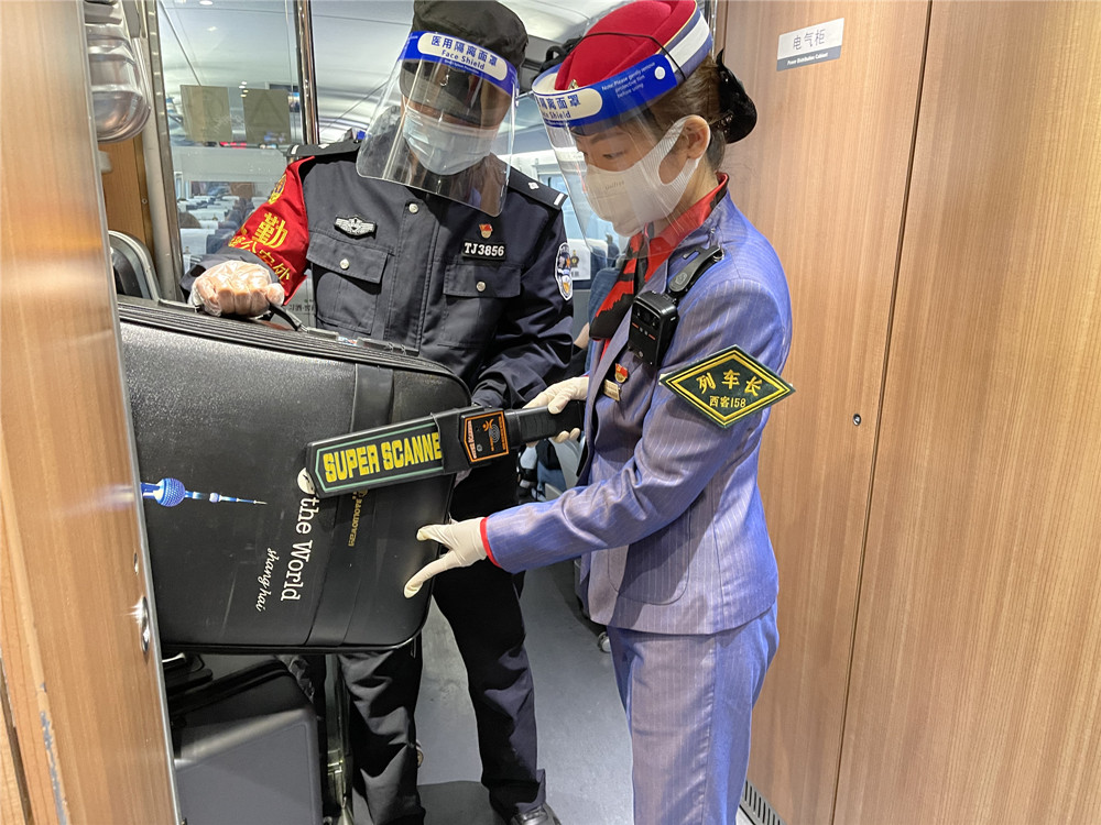 西安“高鐵先鋒”查看乘客行李是否安置好。
