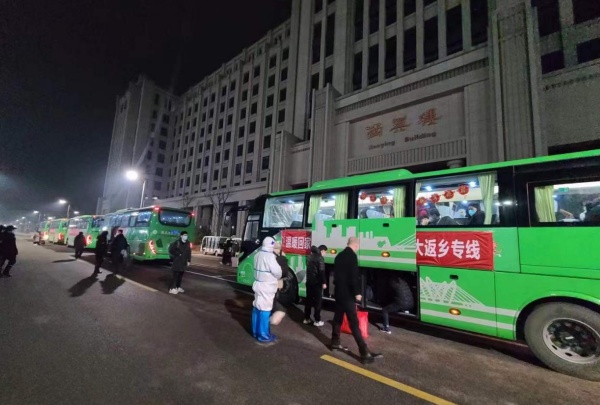 為了保障將創(chuàng)新港學(xué)生閉環(huán)轉(zhuǎn)運至西安“兩站一場”,灃西新城對接西咸公交集團,協(xié)調(diào)了50輛公交車、大巴車,根據(jù)學(xué)生訂票時間制定班次,全程參與暖心返鄉(xiāng)行動,24小時不停歇,點對點將學(xué)生運送至“兩站一場”。