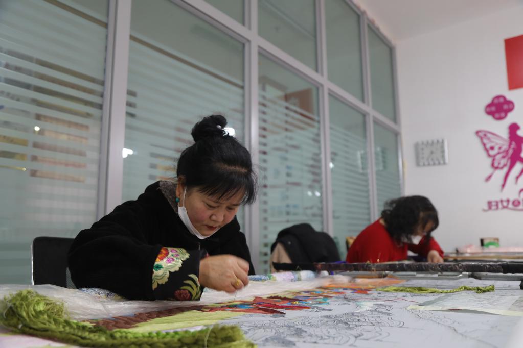 1月24日,繡娘李秀英(左一)和石玉秀(右一)在制作藏繡。新華社記者央秀達(dá)珍 攝
