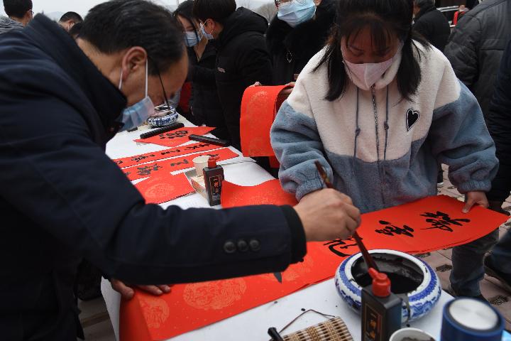 1月24日,厙弆村“三下鄉(xiāng)”現(xiàn)場(chǎng),書(shū)法愛(ài)好者為群眾書(shū)寫(xiě)春聯(lián)。(新華社記者崔翰超 攝)