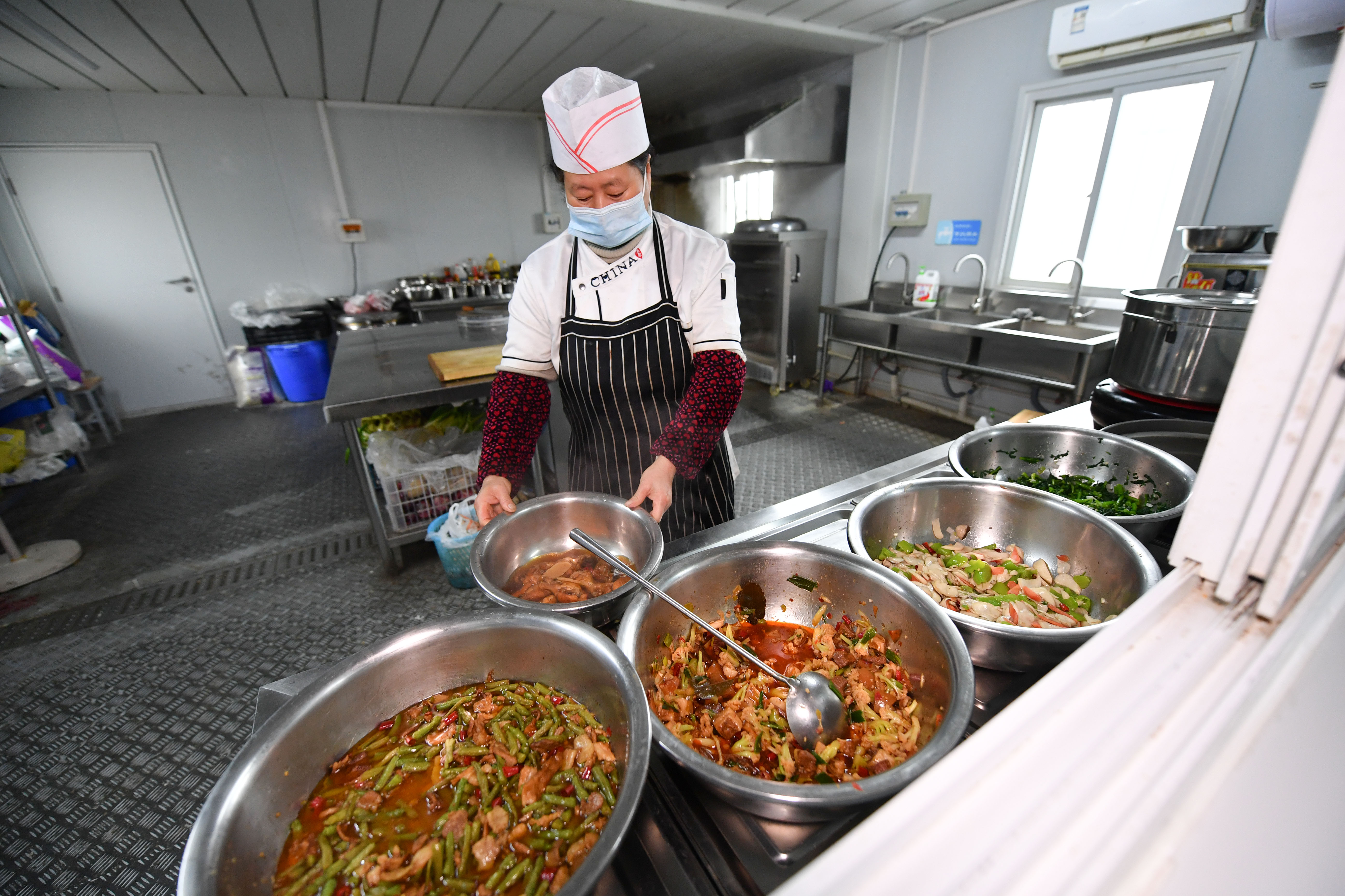 1月30日,在西安市第一實驗學校建設項目工地,留守工地的廚師在廚房準備午餐。