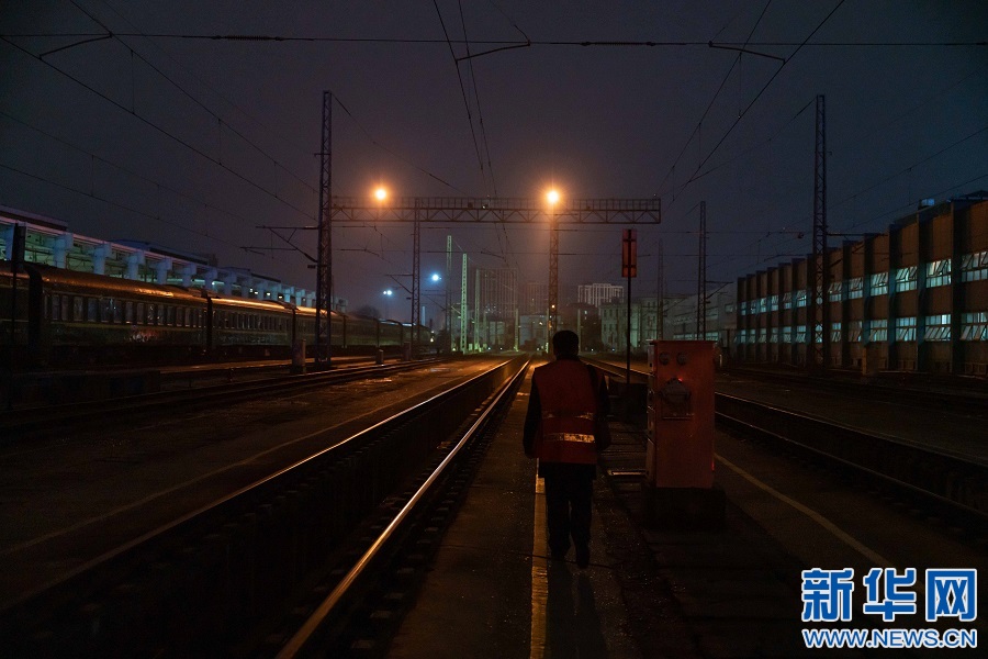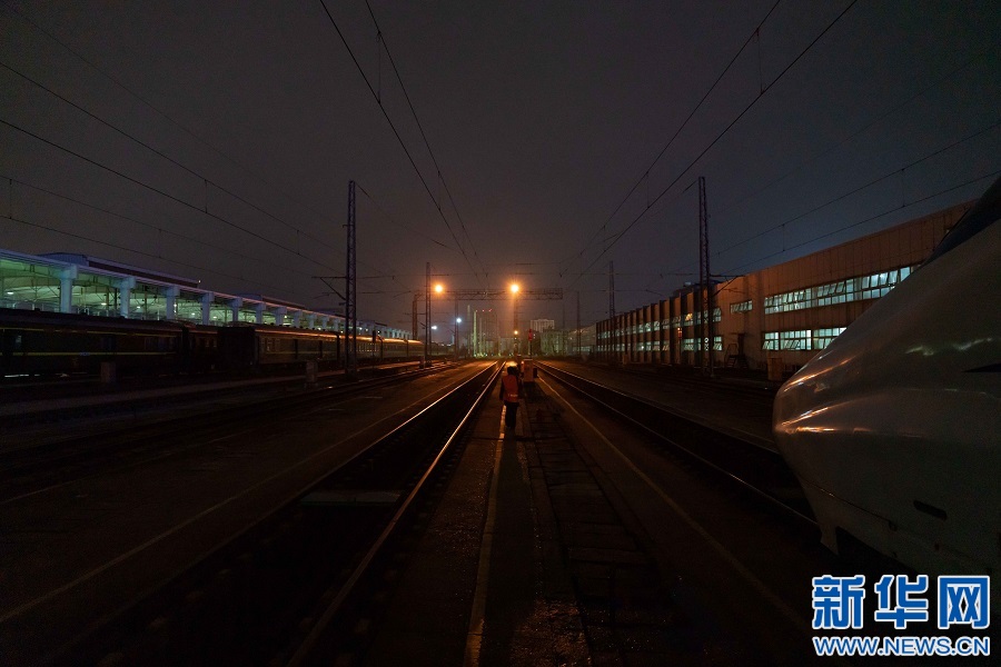 檢查完動(dòng)車(chē)組,蘇盛行走在列車(chē)停車(chē)場(chǎng)內(nèi)。新華網(wǎng)發(fā) 趙磊 攝