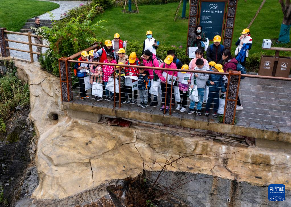 4月17日,參加活動的中小學(xué)生在地質(zhì)專業(yè)工作人員的帶領(lǐng)下,對銅鑼山礦山公園的地質(zhì)遺跡和生態(tài)修復(fù)進行科學(xué)考察(無人機照片)。