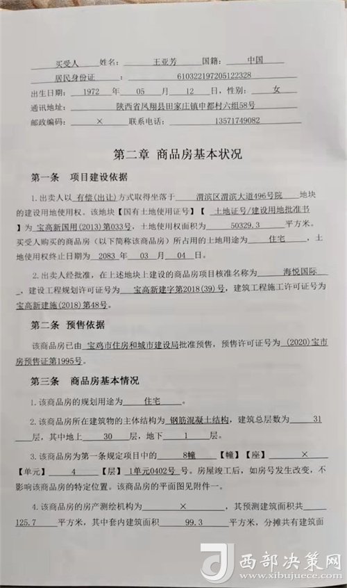 決策熱線|寶雞市民王女士(化名):我于2021年3月在寶雞市高新區(qū)渭濱大道臻和天下看了一套住宅樓,覺(jué)得地段位置也好。經(jīng)過(guò)和家人一起商議,與售樓人員確定了8幢1單元4層?xùn)|戶南北通透的房子,于2021年3月18日簽訂書面商品房買賣合同,于2021年4月15日簽訂按揭貸款合同給開發(fā)商交清了房款,前期共花費(fèi)七十余萬(wàn)。