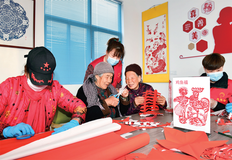 山東省日照市嵐山區(qū)按照就近、普惠原則建設養(yǎng)老服務中心,并組建志愿服務隊為老人提供助餐、助潔、助醫(yī)等愛心服務。圖為2022年2月27日,志愿者在日照市嵐山區(qū)虎山鎮(zhèn)黃家峪村養(yǎng)老服務中心陪老人剪紙、聊天?!⌒氯A社記者 郭緒雷/攝