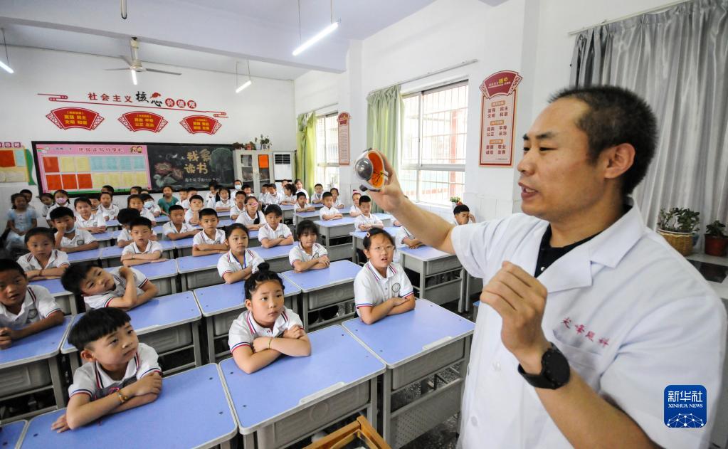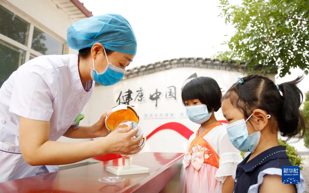 6月5日,河北省邢臺市南和區(qū)人民醫(yī)院醫(yī)務人員深入鄉(xiāng)村開展基層義診活動,為賈宋鎮(zhèn)蘇史張村小朋友講解眼睛的結構和功能。新華社發(fā)(張馳 攝)