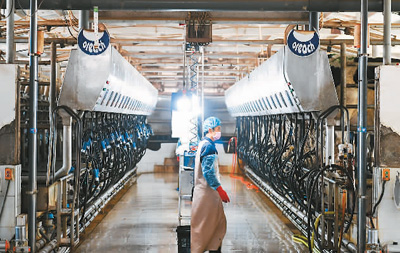 近年來(lái),內(nèi)蒙古自治區(qū)巴彥淖爾市臨河區(qū)干召?gòu)R鎮(zhèn)依托當(dāng)?shù)貎?yōu)勢(shì)大力發(fā)展養(yǎng)牛產(chǎn)業(yè),采取“支部+合作社+基地+農(nóng)戶”的發(fā)展模式,帶動(dòng)農(nóng)戶發(fā)展養(yǎng)牛產(chǎn)業(yè),促進(jìn)農(nóng)戶增收致富,助力鄉(xiāng)村振興。圖為1月19日,巴彥淖爾市臨河區(qū)東鑫奶牛養(yǎng)殖專(zhuān)業(yè)合作社擠奶車(chē)間。貝 赫攝(新華社發(fā))