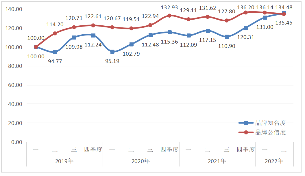 西鳳酒品牌傳播力指數(shù)2022年二季度運行監(jiān)測顯示,西鳳酒品牌傳播力略有提升,達到134.96點。通過節(jié)日宣傳、交流拜訪、基酒項目建設(shè)等活動,西鳳酒品牌知名度和品牌公信度分別達到135.45點和134.48點。