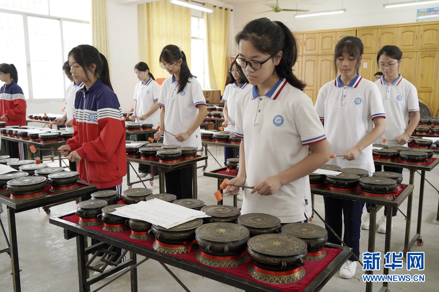 東蘭縣民族中學(xué)學(xué)生在演奏音樂銅鼓。新華網(wǎng) 谷雨 攝