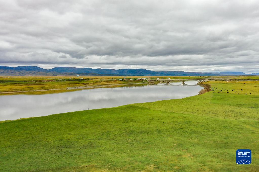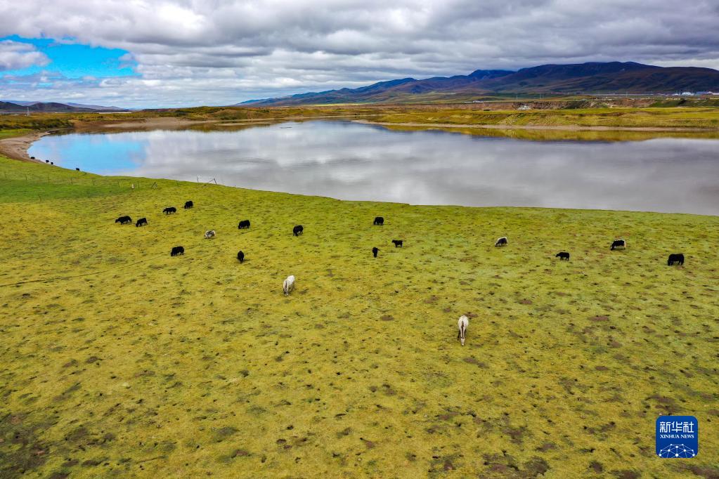 牛群和馬在黃河瑪曲段干流沿岸的一處草地上吃草(9月17日攝,無人機照片)?,斍h在2019年就實現(xiàn)了草畜平衡。新華社記者 郎兵兵 攝