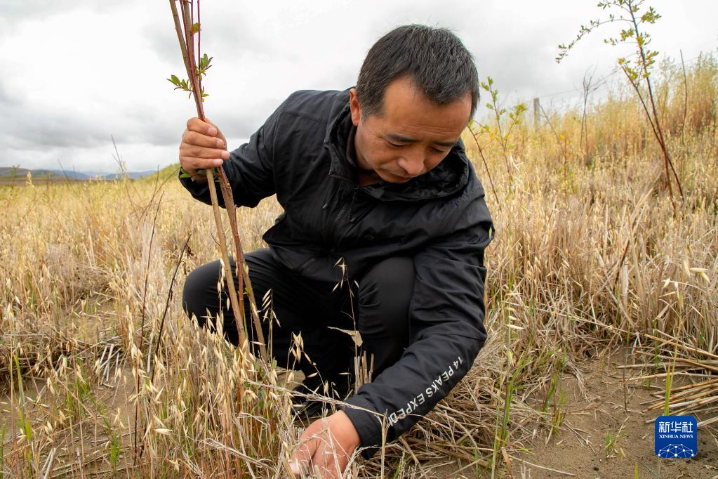 瑪曲縣自然資源局高級工程師馬建云在黃河瑪曲段干流沿岸一處阻沙林帶建設(shè)區(qū)域觀察植被生長情況(9月16日攝)。新華社記者 郎兵兵 攝