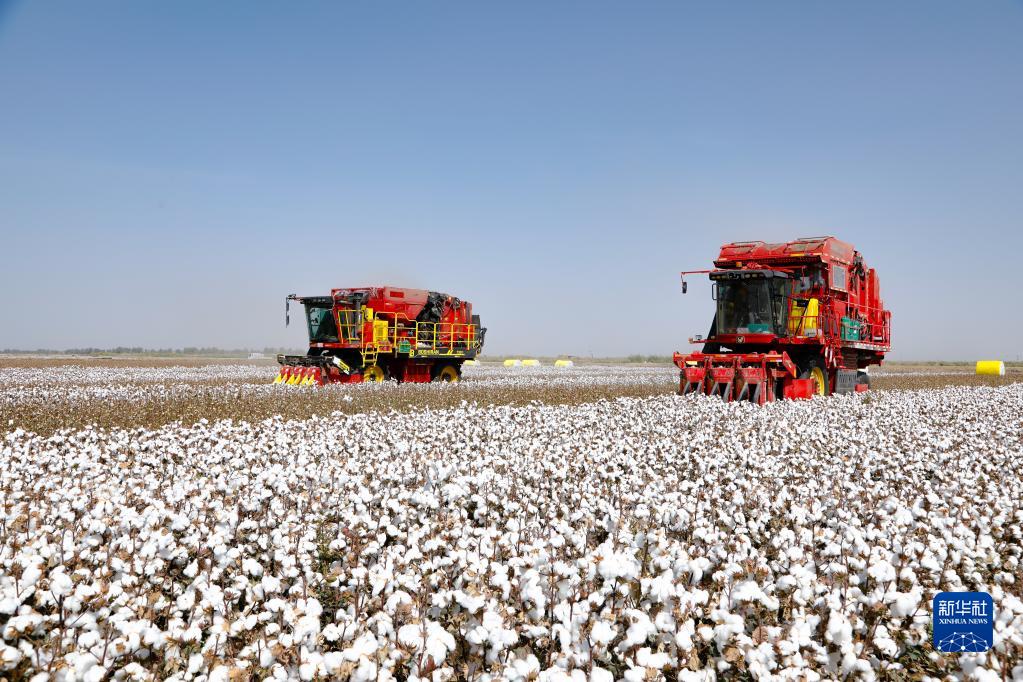 在新疆巴音郭楞蒙古自治州尉犁縣興平鎮(zhèn)統(tǒng)其克村,兩臺國產(chǎn)采棉機在采收棉花(2022年9月30日攝)。新華社發(fā)(汪志鵬 攝)