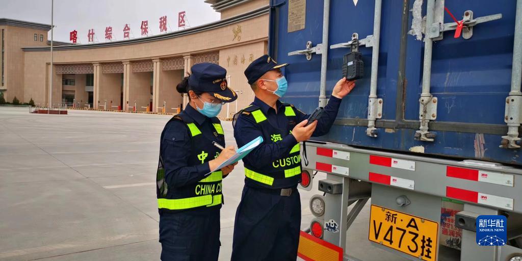 海關(guān)現(xiàn)場關(guān)員在喀什綜合保稅區(qū)登記入?yún)^(qū)車輛電子鎖信息(2022年9月14日攝)。新華社發(fā)(圖爾罕·麥麥提伊敏 攝)