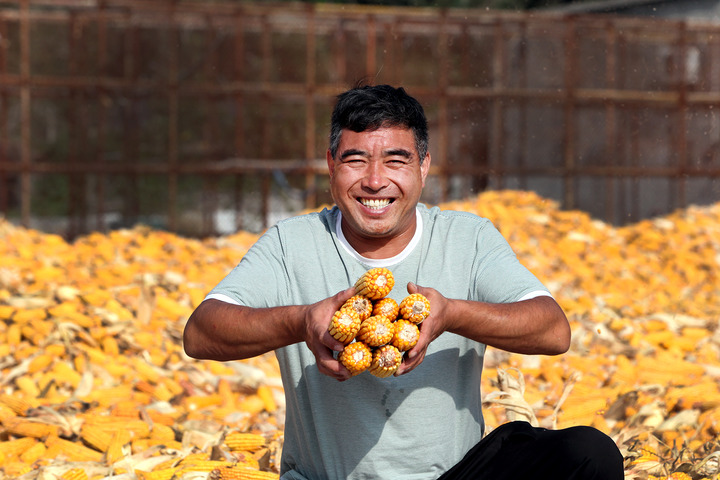 9月22日,在河南焦作博愛縣磨頭鎮(zhèn)崔莊村,“70后”崔衛(wèi)民展示今年豐收的玉米。新華社發(fā)(程全 攝)