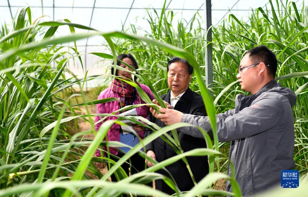 菌草專(zhuān)家林占熺(中)在寧夏銀川市永寧縣閩寧鎮(zhèn)農(nóng)戶劉昌富的大棚里查看菌草生長(zhǎng)情況(2021年3月29日攝)。新華社記者 王鵬 攝