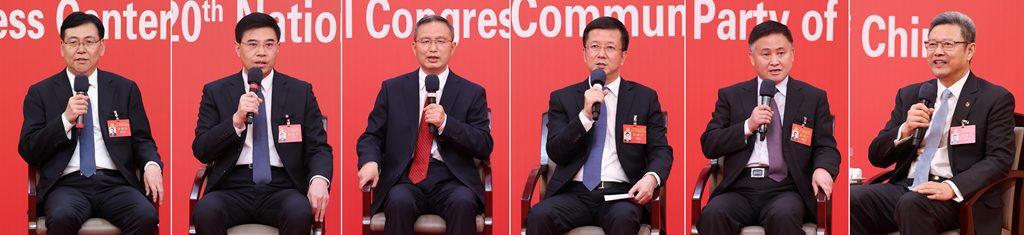 10月20日,中國共產(chǎn)黨第二十次全國代表大會新聞中心舉行集體采訪。青海、寧夏、新疆、中央和國家機(jī)關(guān)、中央金融系統(tǒng)、中央企業(yè)系統(tǒng)(在京)代表團(tuán)新聞發(fā)言人出席,介紹代表團(tuán)學(xué)習(xí)討論二十大報(bào)告情況,并回答記者提問(拼版照片)。新華社記者 張玉薇 攝