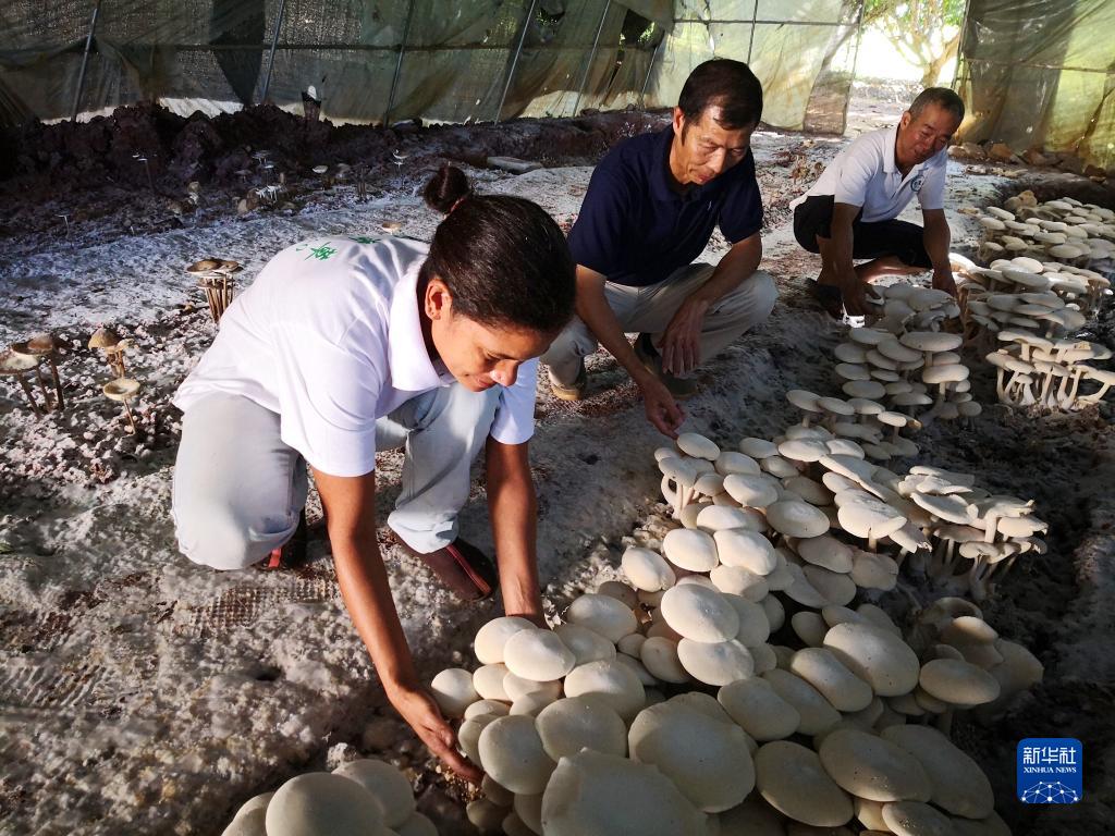 在斐濟楠迪,中國專家和當(dāng)?shù)毓蛦T檢查菌菇生長情況(2018年6月12日攝)。新華社記者 張永興 攝