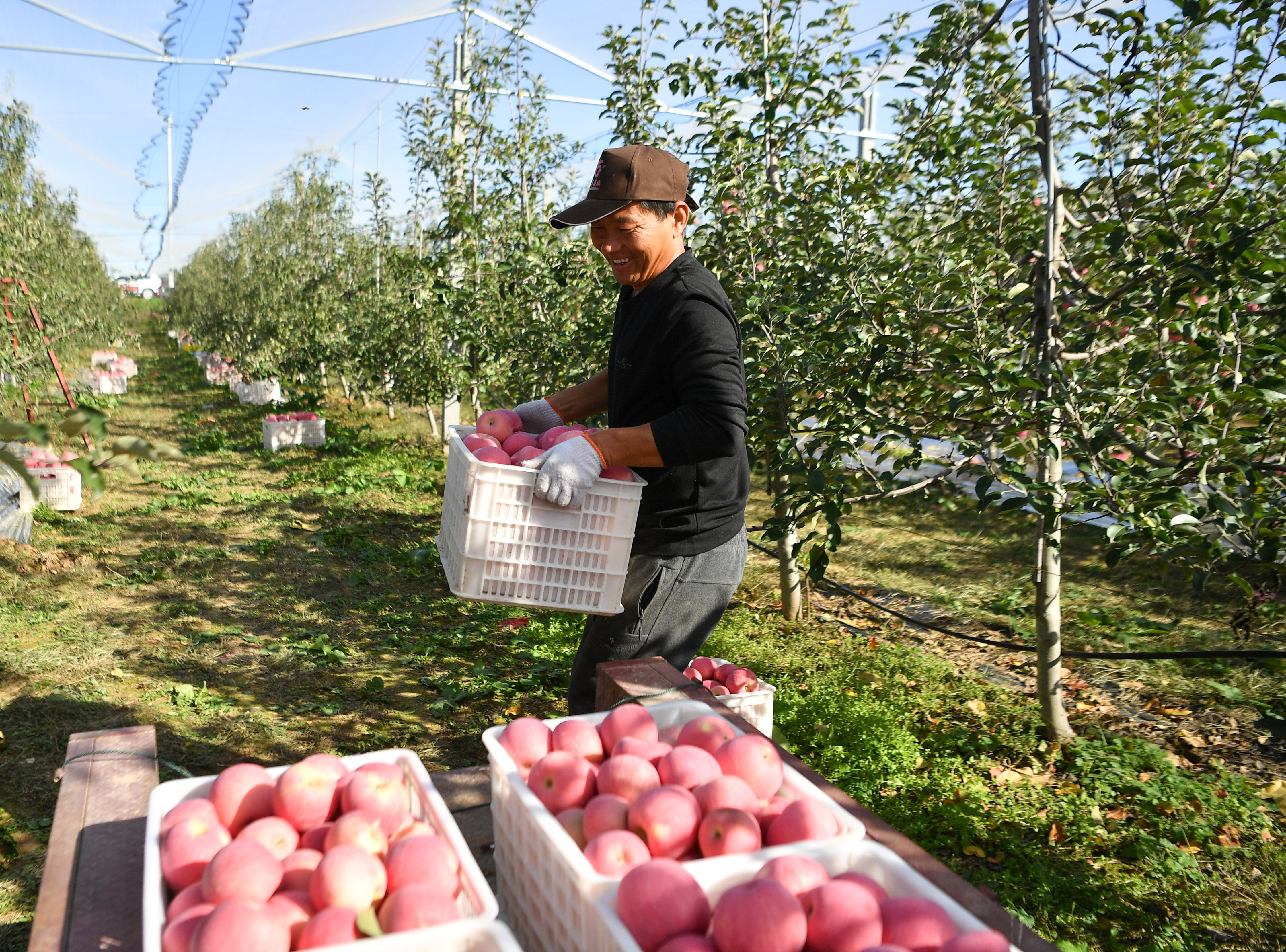 2022年10月10日,在陜西省延安市洛川縣永鄉(xiāng)鎮(zhèn)阿寺村一處果園,果農(nóng)在搬運蘋果。新華社記者 張博文 攝