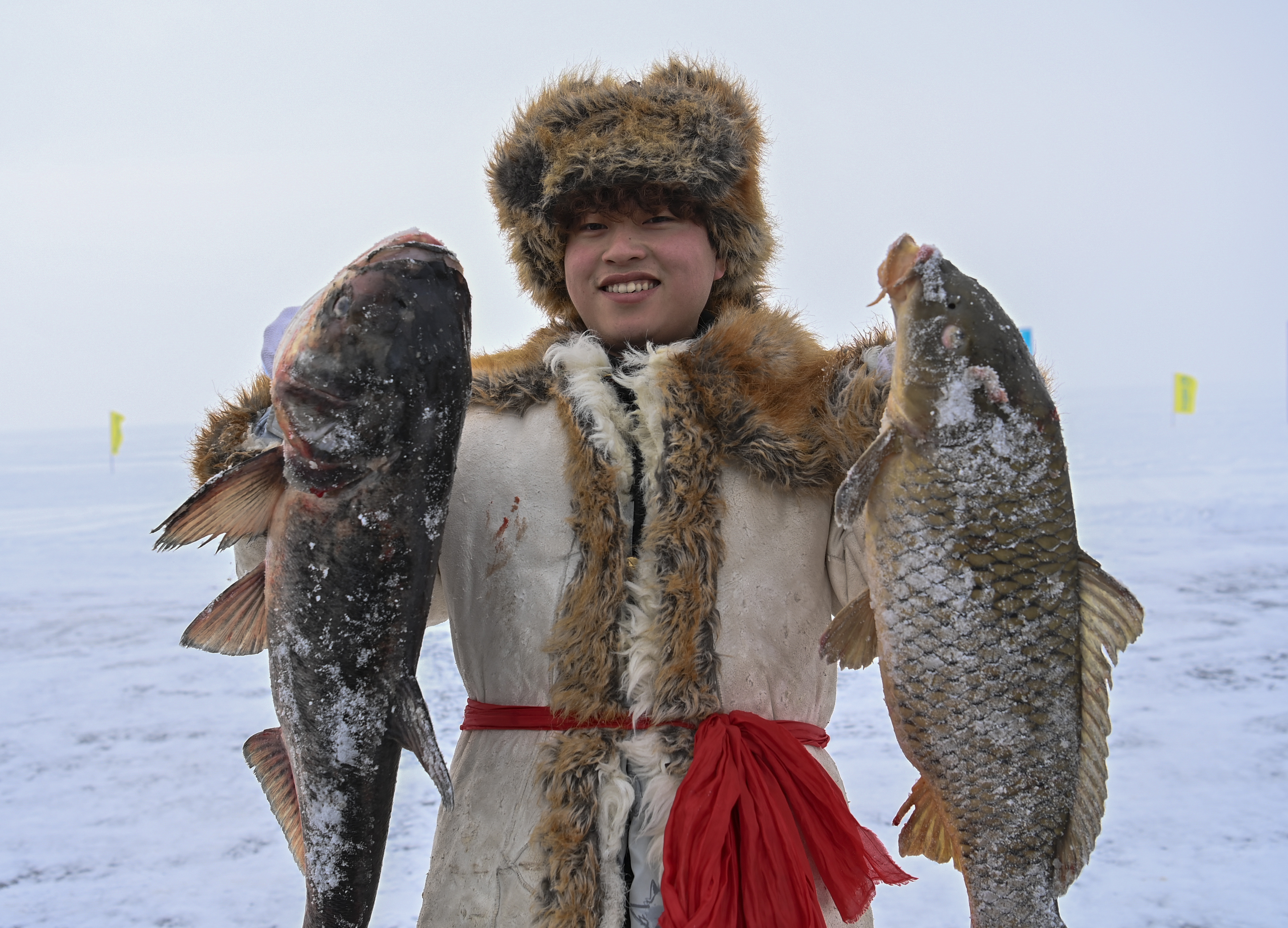 2023年1月7日,在新疆福??h第十六屆烏倫古湖冬捕文化旅游節(jié)上,漁工展示捕到的魚。新華社記者 李響 攝