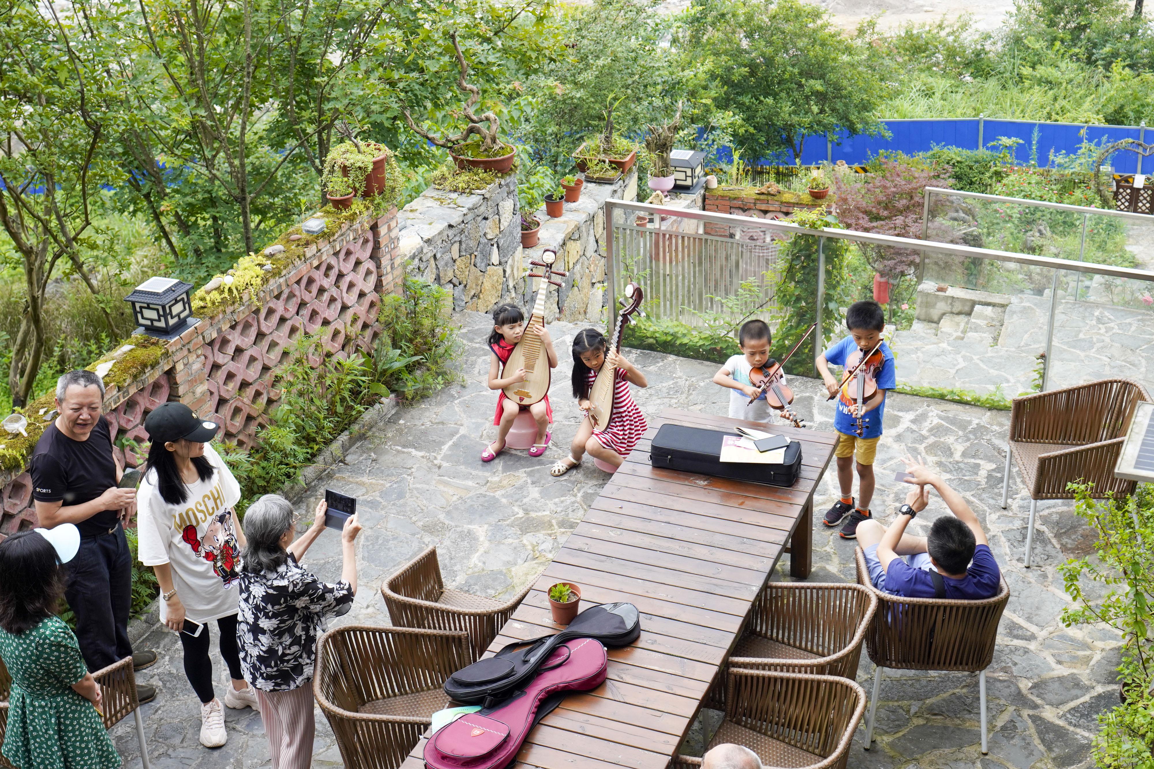 2020年7月30日,在重慶市武隆區(qū)仙女山街道荊竹村一家民宿內(nèi),游客在小院里休閑娛樂。新華社記者 劉潺 攝
