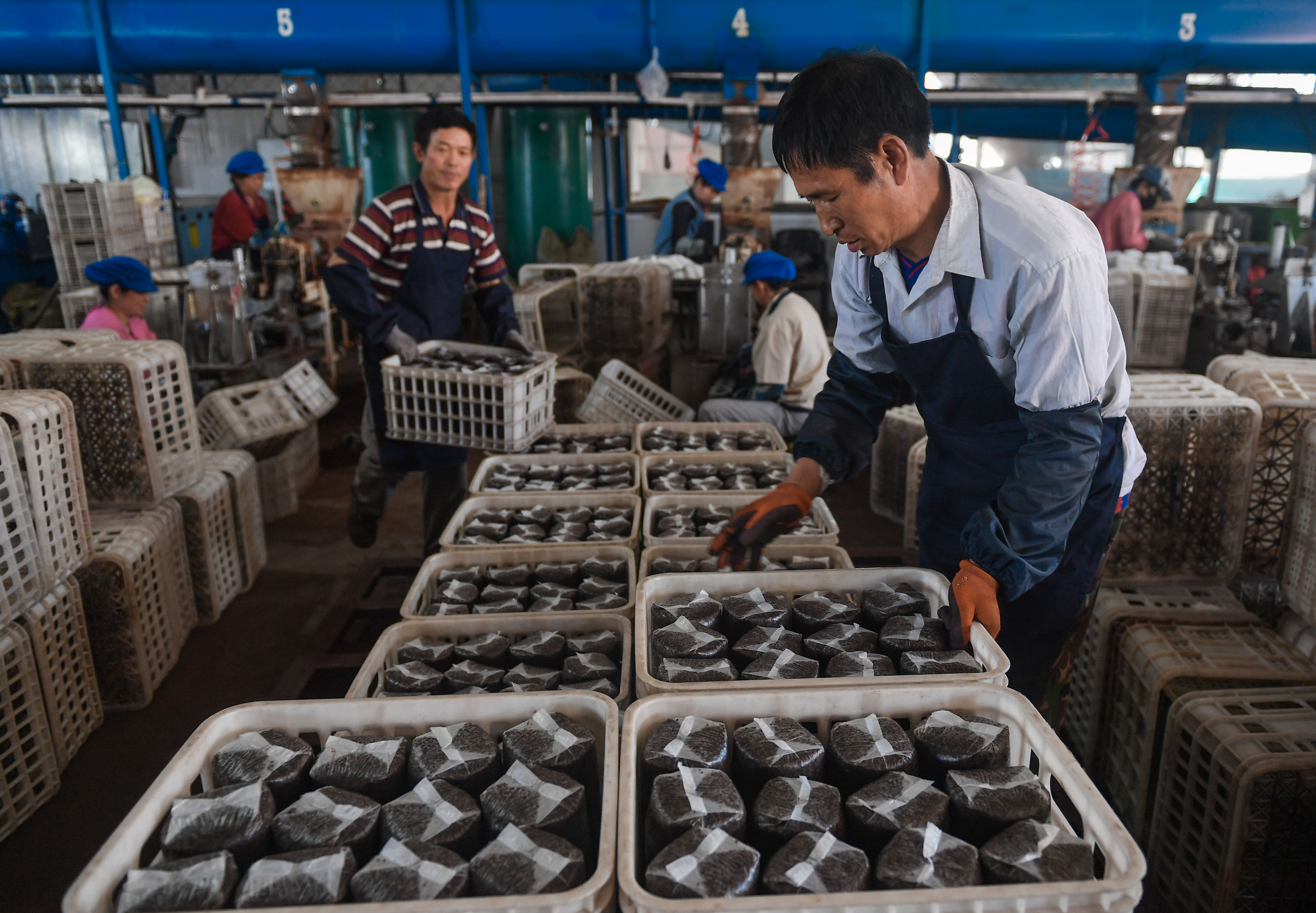 2018年5月24日,吉林省延邊朝鮮族自治州汪清縣天橋嶺鎮(zhèn)農(nóng)民在當(dāng)?shù)匾患揖鼜S內(nèi)搬運制作好的黑木耳菌袋。新華社記者 許暢 攝